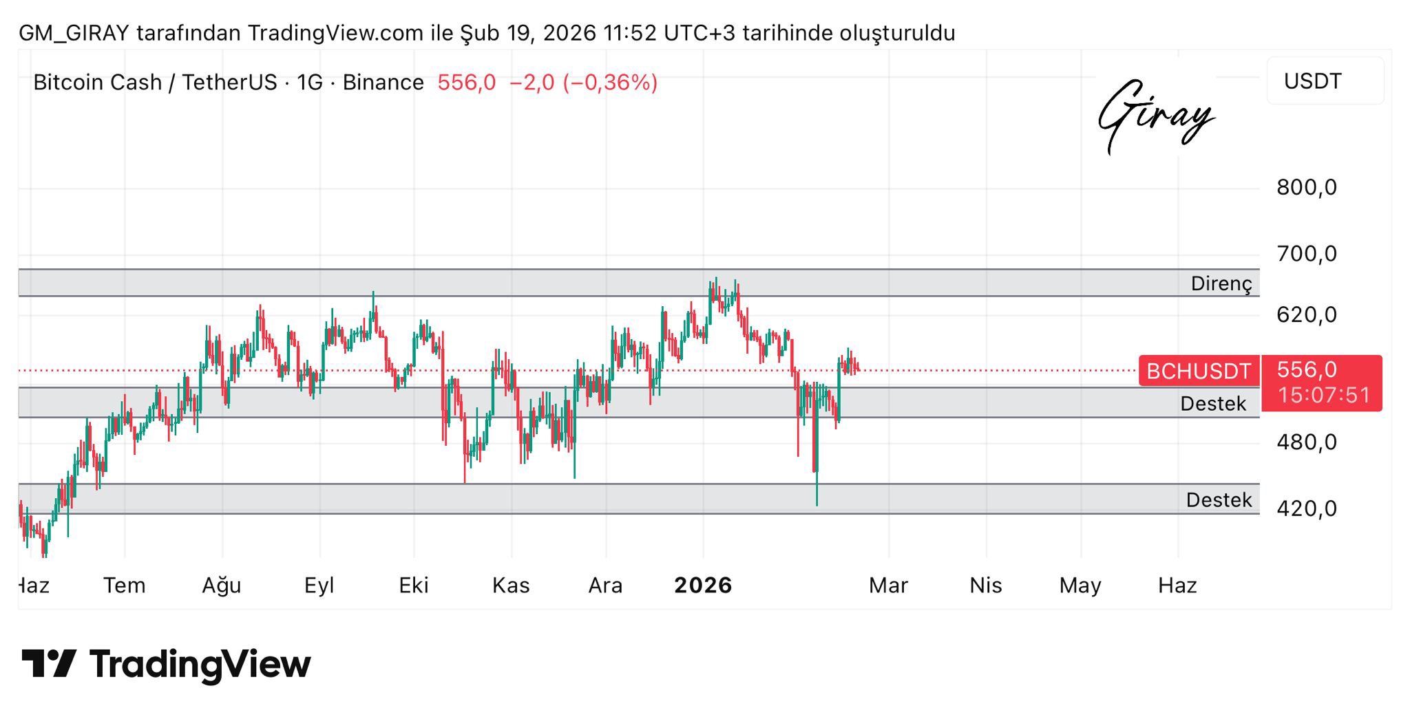 Giray TA_Analyst Educator B138.93K @gmgiray#BCH On the daily chart, it has responded well from our support area; if it does not lose its nearest support, we could see a rise up to the resistance zone. ⚠️Warning: This post does not contain investment advice. It is prepared solely for informational purposes. As always, it is important to do your own research and assess your risks accordingly. My charts are for educational purposes. 📌Due to legal requirements, the brand exchange coin name is displayed, so this is free #Reklam
