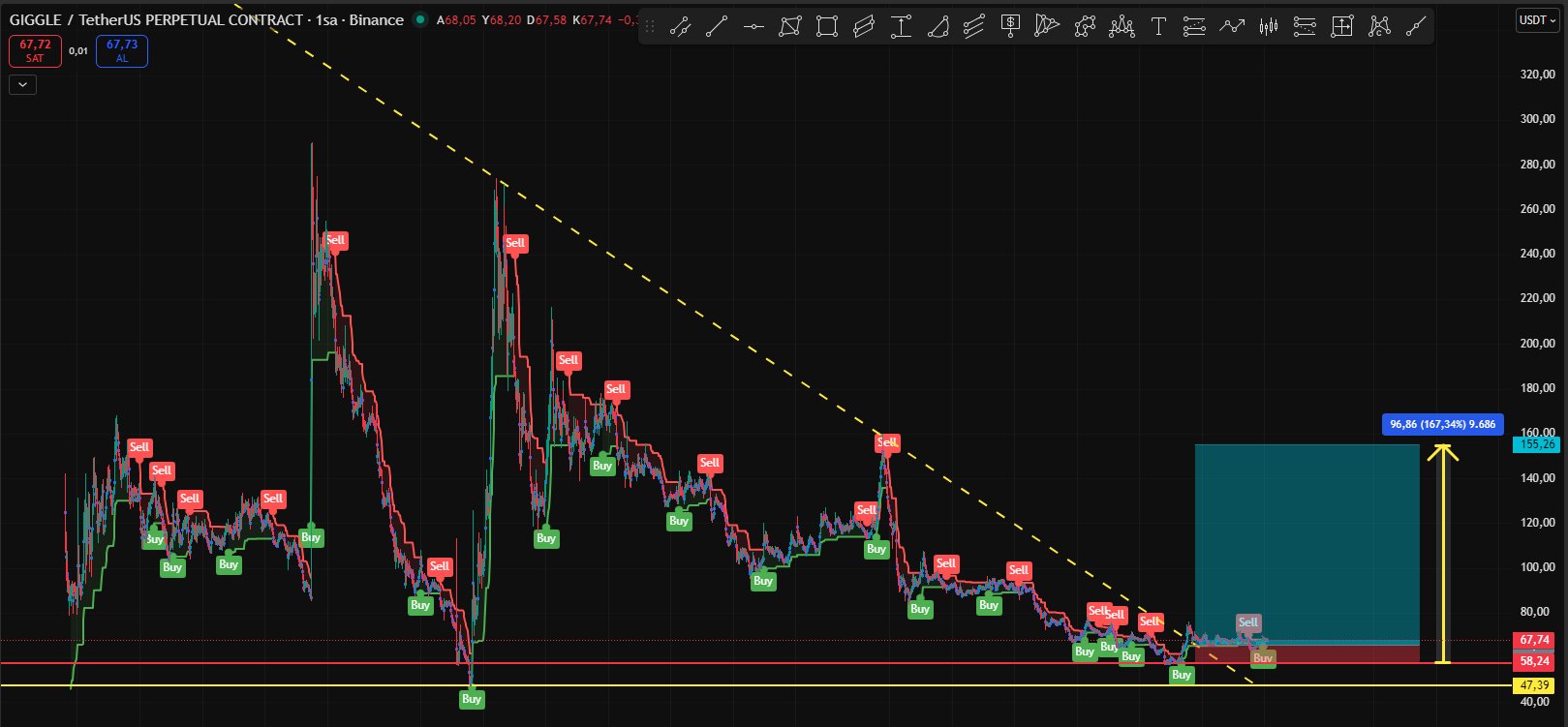 CryptoTrader TA_Analyst Trader B26.98K @TraderEthem#GIGGLE Looks to be holding in the $57 region. $giggle is ideal for buying between $50 / $57. Stop Loss (SL): could be set at $46. Resistance levels at $77 (intermediate), $95, $100 can be targeted as Take Profit (TP). #giggleusdt https://t.co/0DgJjgvgFa