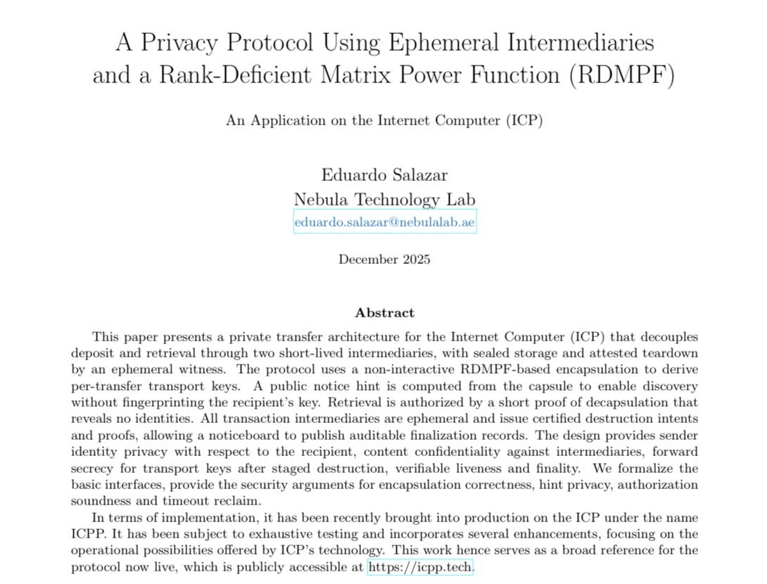 🚨 🔐 Privacy transactions are coming to $ICP — and the design is fundamentally different from privacy chains and ZK-based protocols. Most privacy systems today rely on persistent hiding. Privacy chains and mixers depend on global, long-lived pools where users hide inside a permanent anonymity set. ZK-based protocols improve this by hiding transaction details cryptographically, but they still rely on reusable on-chain state, historical membership proofs, and ever-growing privacy pools. Even if values and addresses are hidden, the pool itself remains forever and becomes a long-term analysis target. The privacy model described in recent ICP research takes a different approach. It does not rely on permanent anonymity sets or global mixers. Instead, it achieves privacy through unlinkability, ephemerality, and execution isolation. Each private transfer is split into two independent phases: a deposit phase and a retrieval phase. These phases are intentionally decoupled. Between them, the system uses short-lived, single-use canisters that hold only sealed payloads, never observe both sender and receiver, and are destroyed immediately after use. There is no reusable privacy pool, no long-term ledger of private interactions, and no historical anonymity set to analyze later. Privacy exists per transfer, not per ecosystem. This architecture is possible because of ICP’s execution model. Canisters are isolated execution units, not shared contracts. State is not globally readable by default, execution is replicated across nodes without publicly replayed traces, and certified state enables verifiable teardown without exposing contents. Sensitive parts of the protocol can additionally run inside trusted execution environments (TEEs) at the node level. This ensures that sealed payloads are never visible to node operators, intermediate secrets never leave protected memory, and even replicas cannot reconstruct sender–receiver links. This is fundamentally different from chains where every validator replays the full transaction logic in the clear. As a result, privacy on ICP is enforced by architecture, not just by cryptography. Example: Alice wants to send assets privately to Bob. Alice deposits assets into an ephemeral routing canister. The payload is sealed and processed inside isolated execution. Bob later retrieves the assets via a different ephemeral route. No canister ever sees both Alice and Bob, and all intermediaries are destroyed after completion. After teardown, no reusable state exists, no transaction graph remains, and no future correlation is possible. Even with full historical access to the chain, there is nothing left to analyze. Compared to ZK-based privacy systems, the difference is clear. ZK systems hide data, but keep permanent pools and long-term state. ICP’s model removes the link before it can ever exist. Privacy does not depend on pool size, future activity, or long-term secrecy assumptions. It depends on unlinkability plus destruction. The most important advantage is that this privacy model is asset-agnostic. Because it operates at the routing and execution layer rather than the asset layer, it automatically applies to all assets integrated into ICP. Through the ck-architecture, assets from Bitcoin, Ethereum, Solana, and beyond — such as ckBTC, ckETH, ckUSDC, and ckSOL — can all be transferred privately using the same unlinkable, ephemeral routing model. No new privacy coins. No fragmented liquidity. One privacy architecture — many assets. And again. Just possible on ICP Find the white paper in the comments below runter ⬇️