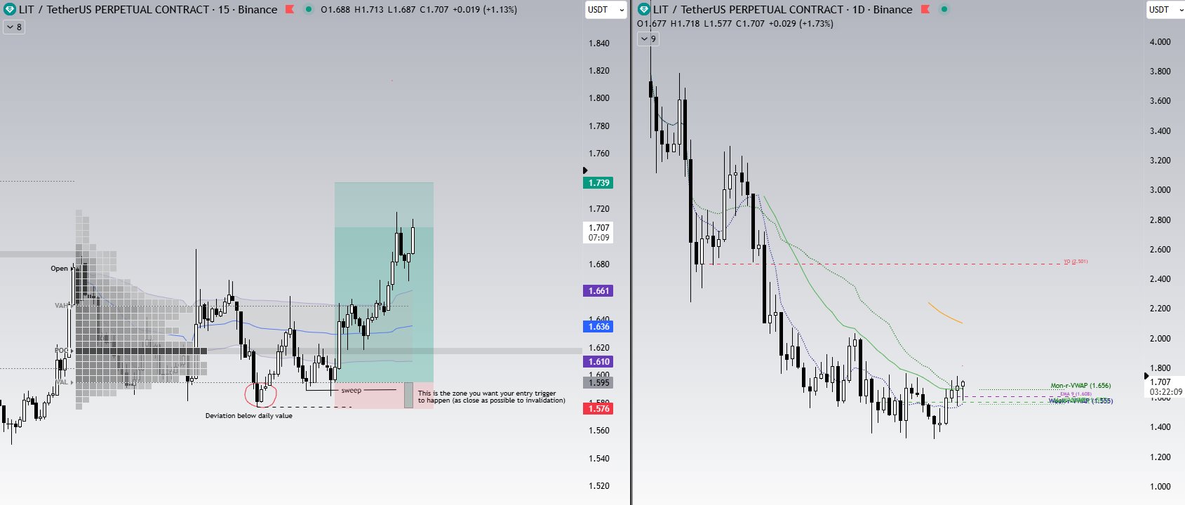 Dead Cat Bounce TA_Analyst Trader B6.01K @DCBcrypto$LIT trade and the first PA lesson in the group: >> We are looking at today's profile The interesting thing that happened was the deviation below the daily value (circled red) - we got price shortly trading outside of our "daily zone" as I'll call it, and then immediate reclaim back in it. That's now the deviation block with the low of the wick - the dashed line being your invalidation for any long attempt. Now the mindset for finding the entry is the following: The VAL of the day should hold, because there rarely is a second deviation. Broke below -> and you can expect price making new lows. For longs, you need a trigger -And we got just that with the 15min sweep of the VAL and the last attempt at that same area. Entry: VAL Targets: manage the trade through the weekly VWAP - if signs of weakness close early, if not - targeting the weekend highs <<