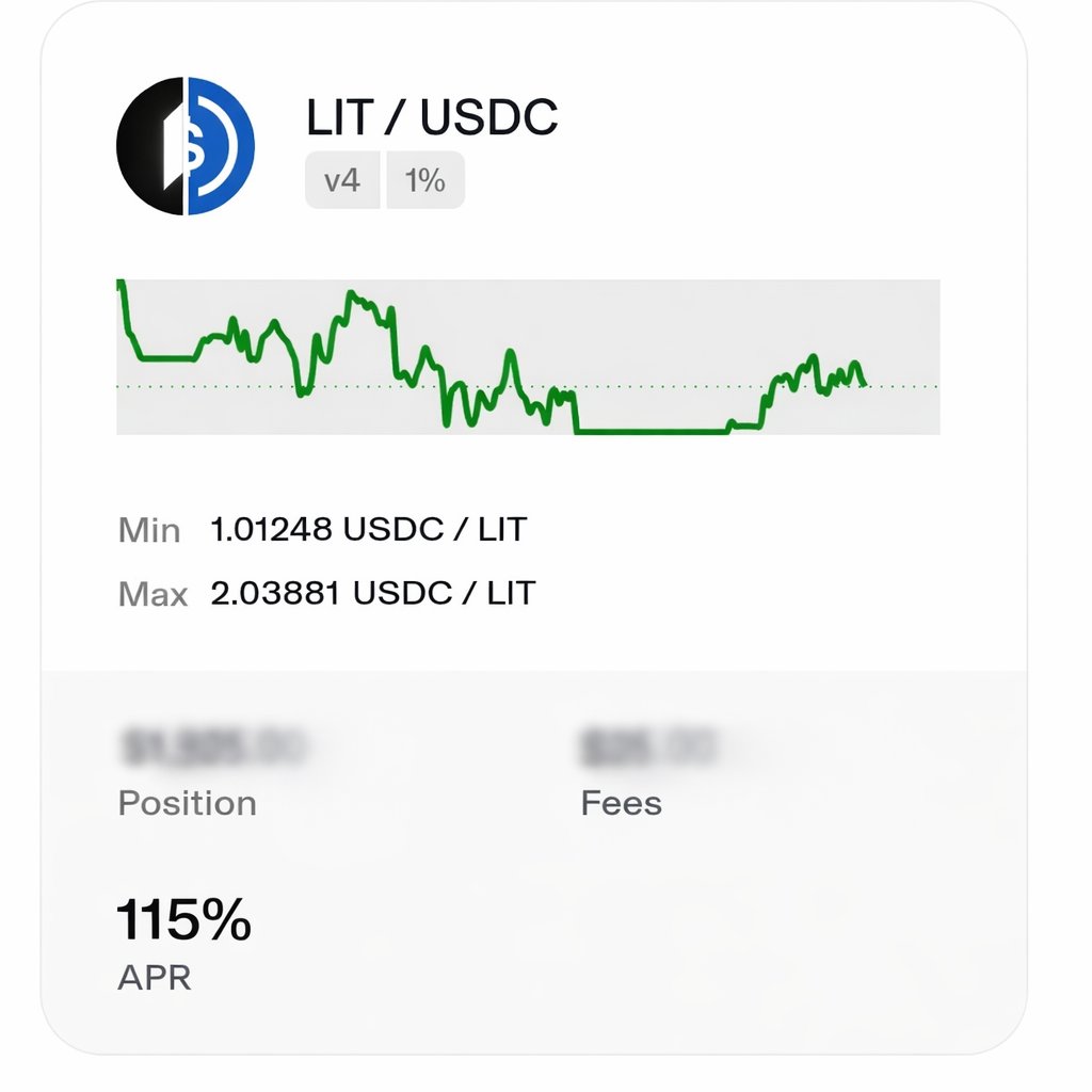 Smart Drop Farmer DeFi_Expert OnChain_Analyst A2.74K @SmartDropFarmerLIT/ USDC LP (Ethereum – Uniswap ) • Current range: 1$ – 2$ • Real APR so far: ~115% If you’re holding $LIT and not sure what to do with it, this can be a nice way to put it to work. Why I’m still in this pool & why I changed the range: - Old range was 1.4 – 2.5 - Market still looks bearish - LIT has been one of the strongest assets vs BTC lately > Price logic: < 1 → insanely cheap, great RR, happy to accumulate LITER > 2 → nice way to slowly sell part of the airdrop