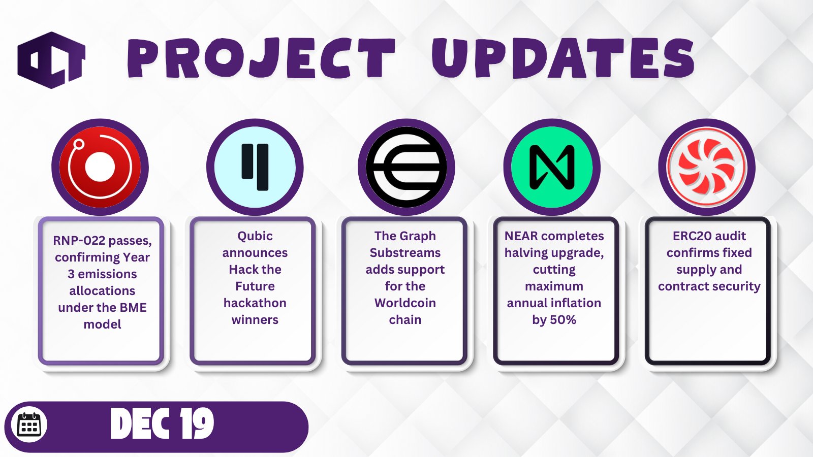 OCT News Media B1.83K @news_oct$RENDER : RNP-022 passes, confirming Year 3 emissions allocations under the BME model. $QUBIC : Qubic announces Hack the Future hackathon winners. $WLD : The Graph Substreams adds support for the Worldcoin chain. $NEAR : NEAR completes halving upgrade, cutting maximum annual inflation by 50% $CLORE : ERC20 audit confirms fixed supply and contract security.