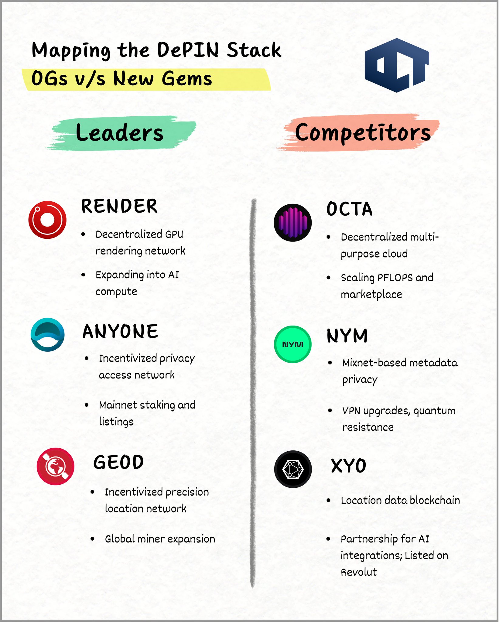 OCT Gems Educator Influencer B11.32K @oct_gemsDePIN isn’t just a niche anymore. It’s projected to become a $150B sector by 2030 as AI, autonomy, and real-world infrastructure move on-chain. Who’s positioned for the next 100×? → $RENDER vs $OCTA → $ANYONE vs $NYM → $GEOD vs $XYO Here’s how the DePIN landscape looks right now 👇 🔴 Render vs OctaSpace: The Battle for Decentralized Compute ✦ Render: the OG of Decentralized GPU Rendering ☞ Vision: Supercharge creative workflows with decentralized GPU power for 3D rendering, spatial computing, AI, and blockchain media. ☞ Tech Stack: Decentralized GPU network · Solana integration · Compute Subnet for AI workloads ☞ Evolution: Shift from pure rendering toward AI‑focused compute; enterprise‑grade GPU onboarding; treasury and emissions transparency. ☞ Recent Behavior: AI Compute Network trial phase (Aug 2025); detailed explainer on emissions, batching, and operations; Render Royale wrapped with Cyber Christmas and Frozen Futures themes. Render was one of the first projects to show that high‑end GPU workloads don’t have to live inside centralized clouds. It started by democratizing access to professional rendering, making it possible for creators to tap global GPU supply without negotiating enterprise contracts. That alone was a meaningful shift. But what’s changed in 2025 is direction. The Compute Subnet signals a clear move toward AI workloads, while the onboarding of enterprise‑grade GPUs shows Render is thinking less about experiments and more about reliability at scale. What stands out is transparency. Render isn’t just pushing upgrades, it’s explaining how batching works, how emissions flow, and how the network sustains itself. That’s usually what mature infrastructure projects do. Even as competition increases, Render still feels anchored in real usage, not narratives. ✦ OctaSpace: the Challenger of Versatile Cloud Platforms ☞ Vision: Instant access to decentralized services for AI, rendering, gaming, and more in a unified platform. ☞ Tech Stack: Layer‑1 blockchain · Virtualized environments · Marketplace for AI agents and models. ☞ Evolution: First Web3 provider with full virtualized environments in July 2025 · New marketplace launch in January 2025 for AI tools and games. ☞ Recent Behavior: Made mining for NeptunePrivacy live with one‑click setup; Announced achievement of 59 PFLOPS computational power, entering top 50 supercomputer territory. OctaSpace approaches DePIN from a different angle. Rather than specializing narrowly in rendering, it’s building a full‑stack decentralized cloud one where users can launch AI agents, train models, render workloads, and host services inside virtualized environments. The 59 PFLOPS milestone matters because it reframes OctaSpace from “alternative compute” to serious infrastructure capacity. Its marketplace strategy in 2025 suggests a focus on user adoption and revenue flow, not just raw hardware numbers. While broader DePIN hype has cooled at times, OctaSpace continues layering features virtual environments, AI tools, privacy mining to make the platform useful day‑to‑day. 👉 Comparison: Render focuses on depth specialized GPU rendering and AI compute. OctaSpace focuses on breadth a multi‑use decentralized cloud stack. 🔵ANYONE vs NYM: The Battle for Privacy Networks ✦ ANYONE: the OG of Censorship‑Resistant Access ☞ Vision: Secure, decentralized internet access with privacy and token incentives for a global network. ☞ Tech Stack: DePIN infrastructure · Privacy‑focused protocols · Token‑based rewards. ☞ Evolution: Technical strides in December 2025 · Kraken spot trading listing in December 2025 as first top‑5 exchange. ☞ Recent Behavior: Rolled out mainnet staking with auto‑compounding and operator selection; Deployed mainnet contracts on Ethereum; Distributed final testnet rewards and revamped ecosystem page highlighting app integrations. ANYONE is focused on practical privacy, not abstract cryptography. It builds real infrastructure nodes that provide censorship‑resistant access and uses token incentives to keep the network alive and growing. The 2025 rollout of staking, operator selection, and Ethereum contracts shows the project shifting from build mode into network scaling mode. A top‑tier exchange listing adds visibility, but the real signal is the steady expansion of integrations and applications highlighted in its ecosystem updates. ANYONE’s thesis is simple: people want privacy if it doesn’t slow them down. ✦ NYM: the Challenger of Advanced Mixnets ☞ Vision: End‑to‑end privacy for communications, protecting against surveillance in Web3 and beyond. ☞ Tech Stack: Mixnet architecture · NymVPN · Quantum‑resistant key exchange. ☞ Evolution: Quantum‑resistant rollout across stack in 2025 · Improved delegations and Binance bridge in August 2025. ☞ Recent Behavior: Released NymVPN v2025.20 with custom DNS support for multiple platforms; Introduced dApp mode for metadata shielding in Ethereum interactions; Announced collaboration with XX Network for quantum‑safe privacy enhancements. NYM tackles privacy at a deeper layer. Instead of just encrypting traffic, its mixnet obscures who is talking to whom, protecting against metadata analysis one of the hardest problems in privacy. The 2025 upgrades focus on resilience: Decentralization improvements to avoid outages, VPN usability upgrades, and quantum‑safe cryptography baked into the protocol. NYM isn’t chasing mass simplicity first. It’s building for high‑stakes privacy environments where failure isn’t an option. 👉 Comparison: ANYONE prioritizes usability and incentives. NYM prioritizes deep, protocol‑level anonymity and future‑proof security. 🔴GEODNET vs XYO: The Battle for Location Oracles ✦ GEODNET: the OG of Precision RTK Networks ☞ Vision: Fuel autonomous systems like robots and drones with cen