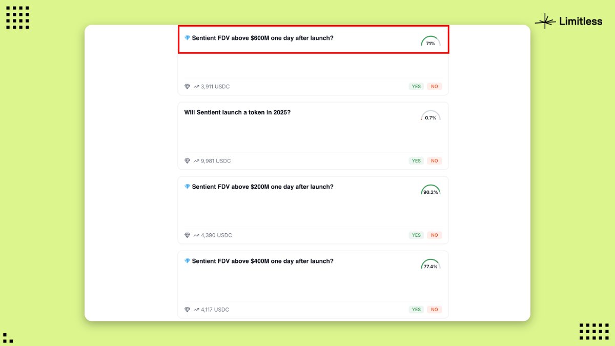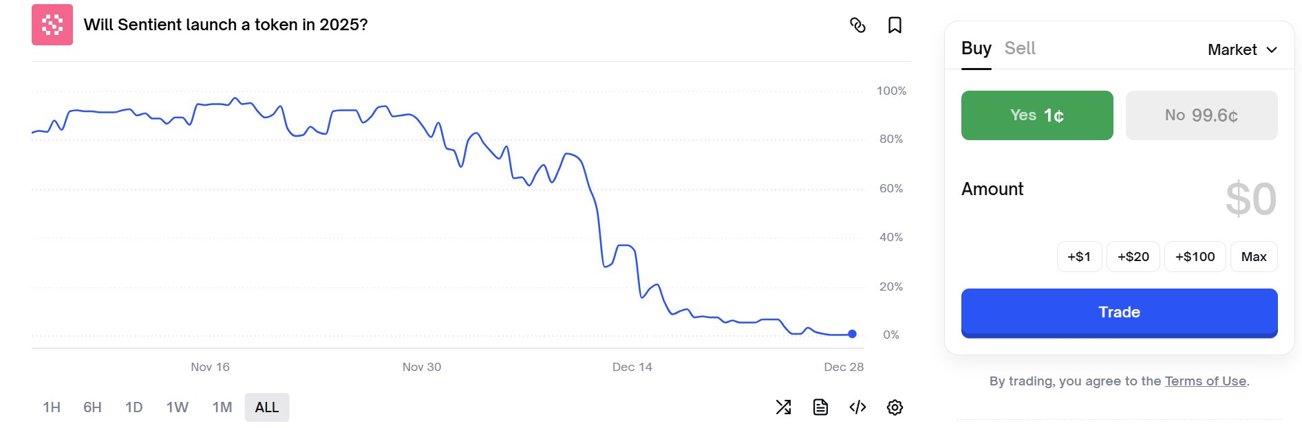Doxxed🎒 OnChain_Analyst Influencer A5.20K @CryptosamaraiEveryone are quite bullish that @SentientAGI were going to launch their token in Q4,2025. But the team coming out to state that there will not be a token launch actually made the ‘yes’ on polymarket purge lower. But this announcement only gives more strength to $SENT as it is going to be a community driven token for creators who are integrated on the GRID because they are going to be incentive based. Just so we know that SENT will play a major role in the launch of the GRID when it finally goes public because it is going to power it. Remember AGI is going to be a huge narrative for 2026, making that bet with sentient is just another huge step ahead.