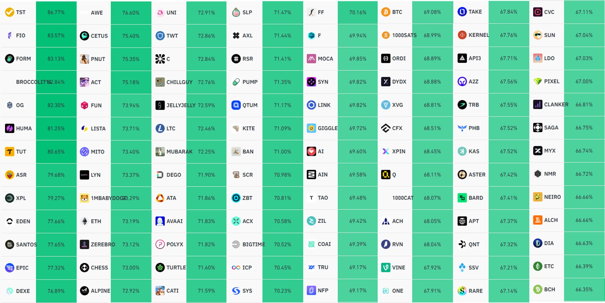 CW OnChain_Analyst TA_Analyst B17.74K @CW8900Binance's top traders are extremely bullish on $TST, $FIO, $FORM, $OG, $HUMA, and $TUT. Their long positions exceed 80%. Furthermore, long positions in $XPL, $EDEN, $DEXE, $SANTOS, $EPIC, $DEXE, $AWE, $CETUS, $PNUT, and $ACT are over 75%, indicating a high upside potential. Other cryptocurrencies include $ETH, $UNI, $LTC, $AXL, $RSR, $PUMP, $QTUM, $ICP, and $SYS, with long positions exceeding 70%. Long positions in $LINK, $TAO, $ZIL, $BTC, $XVG, $RVN, $ONE, $KAS, $ASTER, $APT, $QNT, $LDO, $NMR, $ETC, and $BCH are also over 65%.