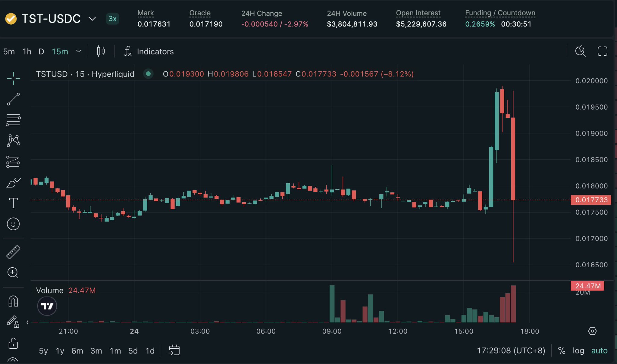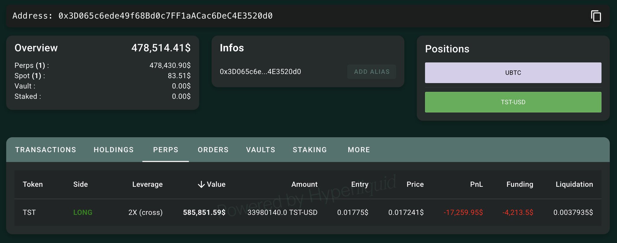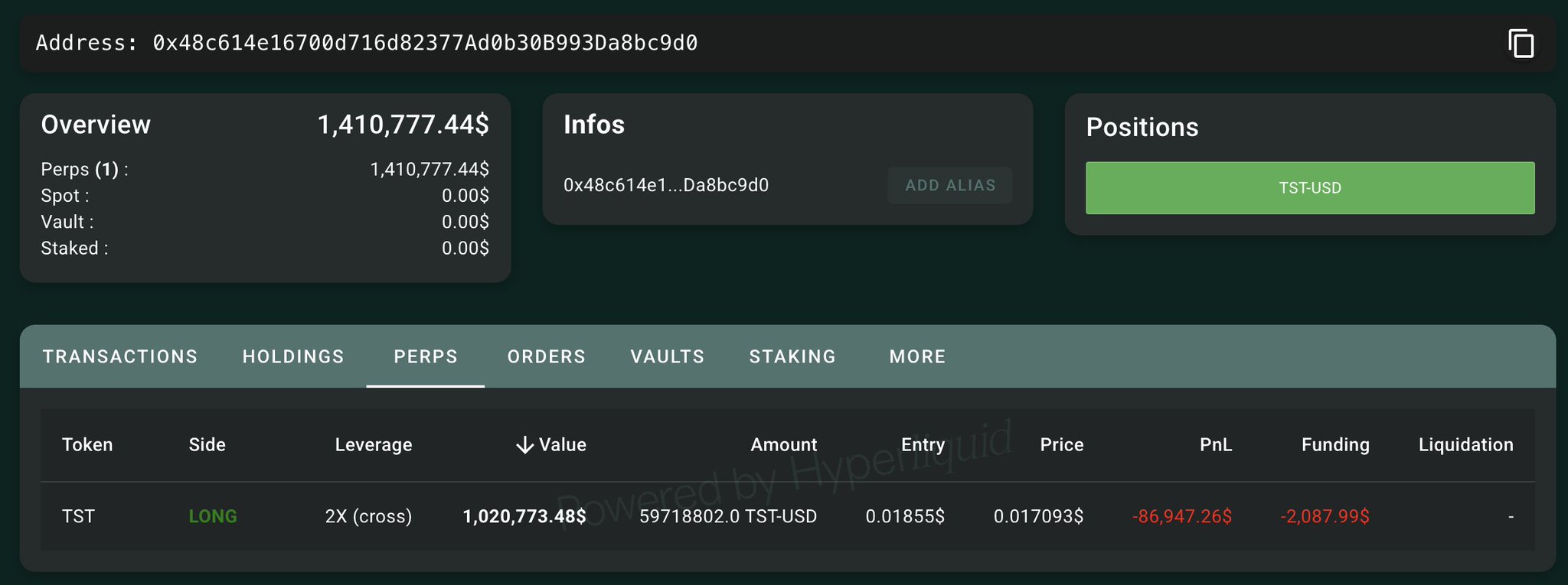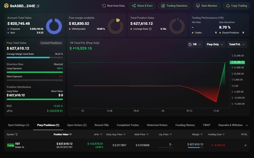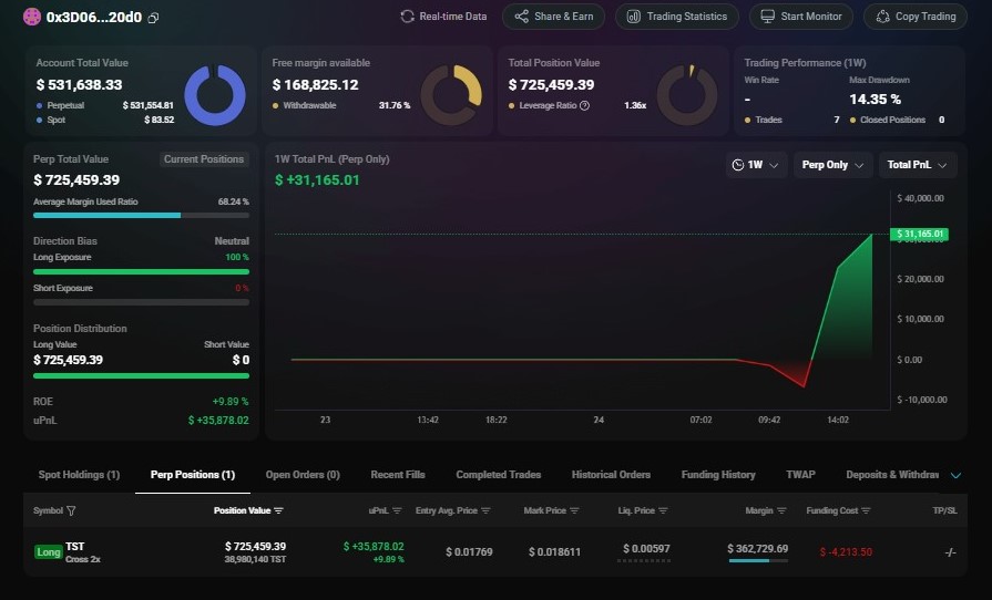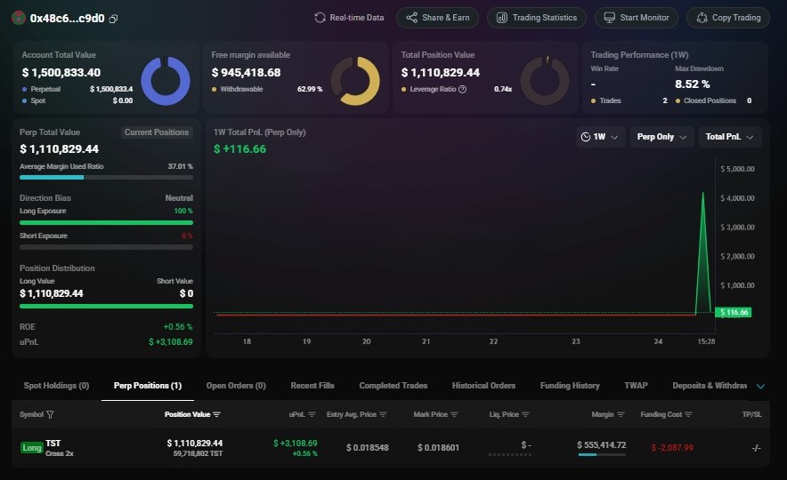Lookonchain OnChain_Analyst Media C677.42K @lookonchainWatch $TST — it appears someone may be manipulating the price. A whale created 3 wallets and deposited 2.47M $USDC into Hyperliquid, going long 127.4M $TST($2.2M) with 1x–2x leverage. This whale is still accumulating $TST long positions. https://t.co/PbWxqdQkhU https://t.co/8fdfd8APc5 https://t.co/dpaSPfEime
