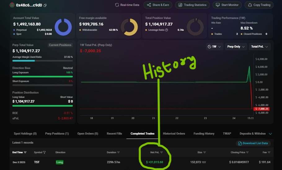吴说区块链 Media Researcher D170.50K @wublockchain12Wu reported that, according to monitoring by @ai_9684xtpa, three addresses deposited approximately 2.47 million USDC to Hyperliquid in the past 24 hours, collectively opening about $1.69 million worth of TST long positions, representing 42.3% of the platform's total TST OI and ranking in the top three for long holdings. Analysis suggests these addresses may belong to the same entity: each transferred BTCB from Gate, deposited to Aster, and then withdrew USDT; margins were withdrawn from Gate or OKX within the last 24 hours and directly deposited to Hyperliquid; TST longs are currently the only positions on Hyperliquid. Notably, address 0x48c…bc9d0 made a TST long trade in early December, earning roughly $31,000. https://t.co/Em4T2Jr3vw