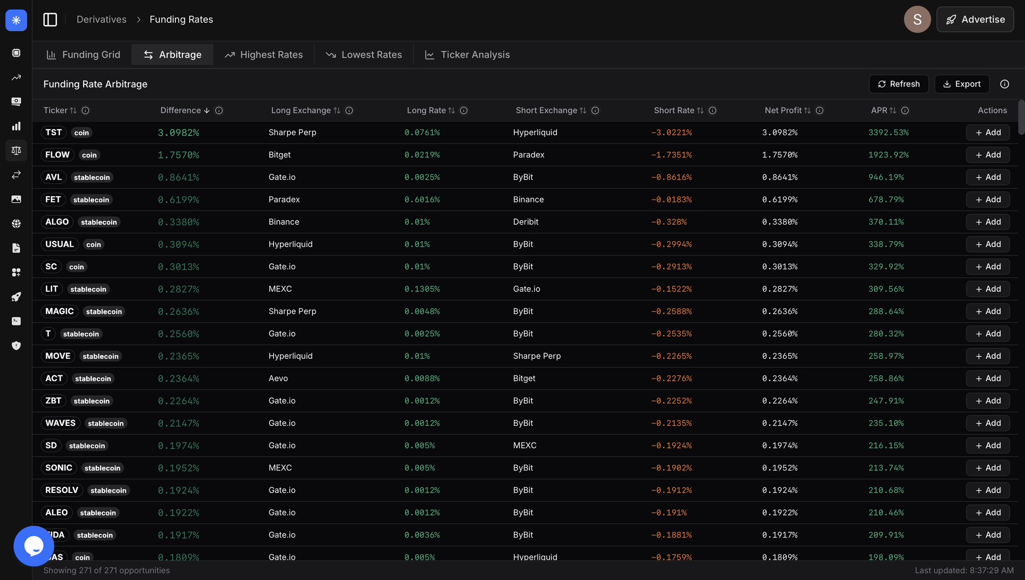Sharpe AI Researcher Trader C132.01K @SharpeLabsEveryone’s arguing narratives on the last day of 2025, while funding arbitrage is printing insane 4-digit APRs 👀 Top 10 funding rate arbitrage opportunities right now: • $TST — 3392% APR • $FLOW — 1923% APR • $AVL — 946% APR • $FET — 678% APR • $ALGO — 370% APR • $USUAL — 338% APR • $SC — 329% APR • $LIT — 309% APR • $MAGIC — 288% APR • $T — 280% APR Pure funding inefficiency.