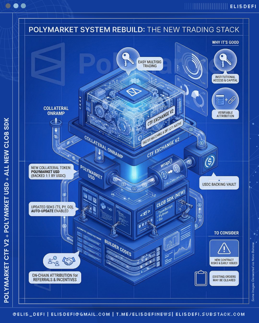 Eli5DeFi Media Educator C44.93K @Eli5defiICYMI, @Polymarket is rebuilding its trading system from top to bottom, it was fee system and now it's the entire stacks. New contracts, a new order book, and a new stablecoin. Here are the changes, in plain English. — ❶ New trading contract (CTF Exchange V2) This is the main on-chain engine that handles trades. It is built to process orders more efficiently and match trades faster. It also supports EIP-1271, which means smart contract wallets like Safe, Argent, and multisig wallets can trade without workarounds. ❷ New token for deposits (Polymarket USD) This replaces USDC.e as the token you use as collateral. It is backed 1:1 by $USDC. If you are a normal user, you will just approve it once in the app. If you use the API, you may need to call wrap() on the Collateral Onramp contract to convert your USDC into Polymarket USD. ❸ New order book software kit (New CLOB SDK) There are updated SDKs for TypeScript, Python, and Go. They can handle the switch to V2 automatically, but only if you upgrade to the l